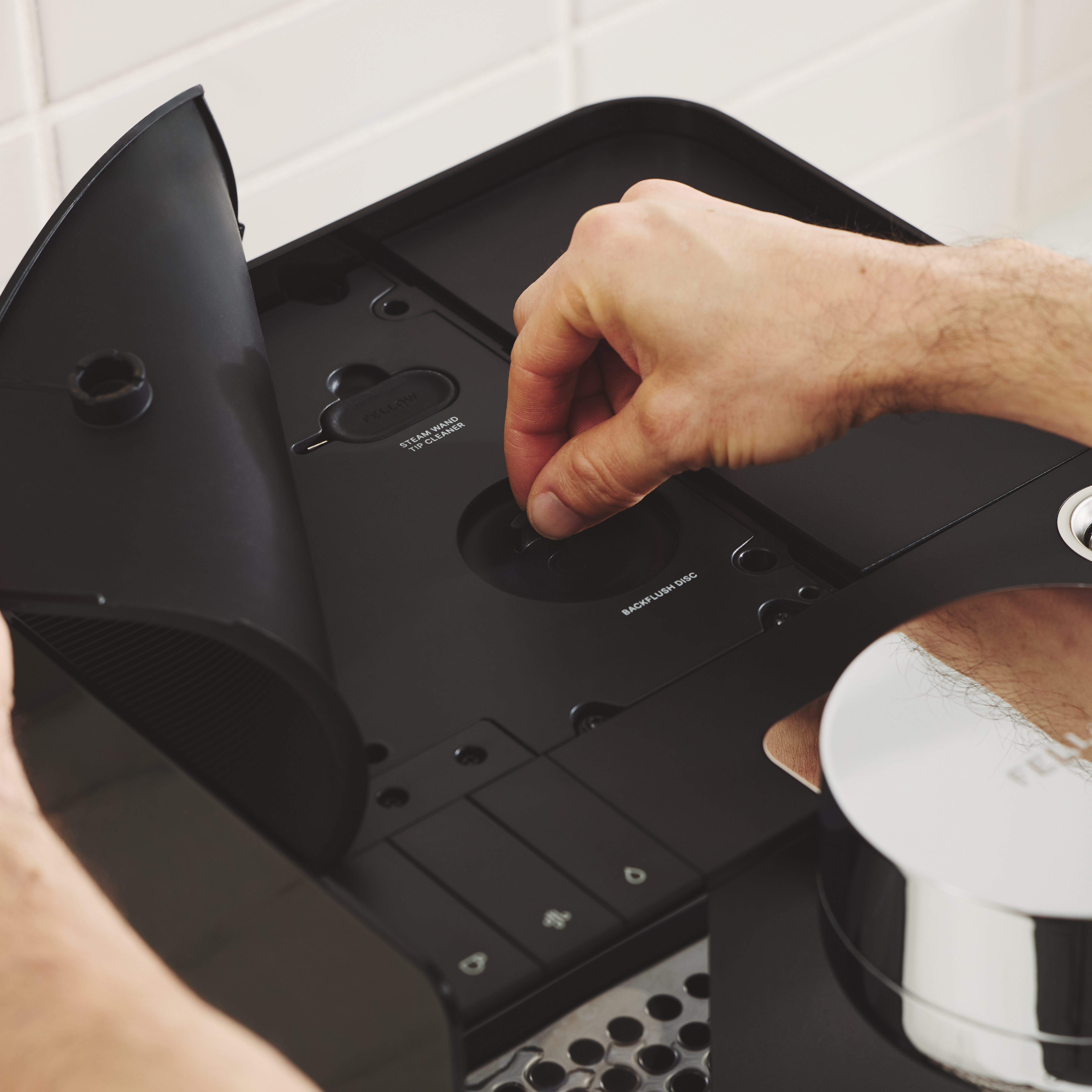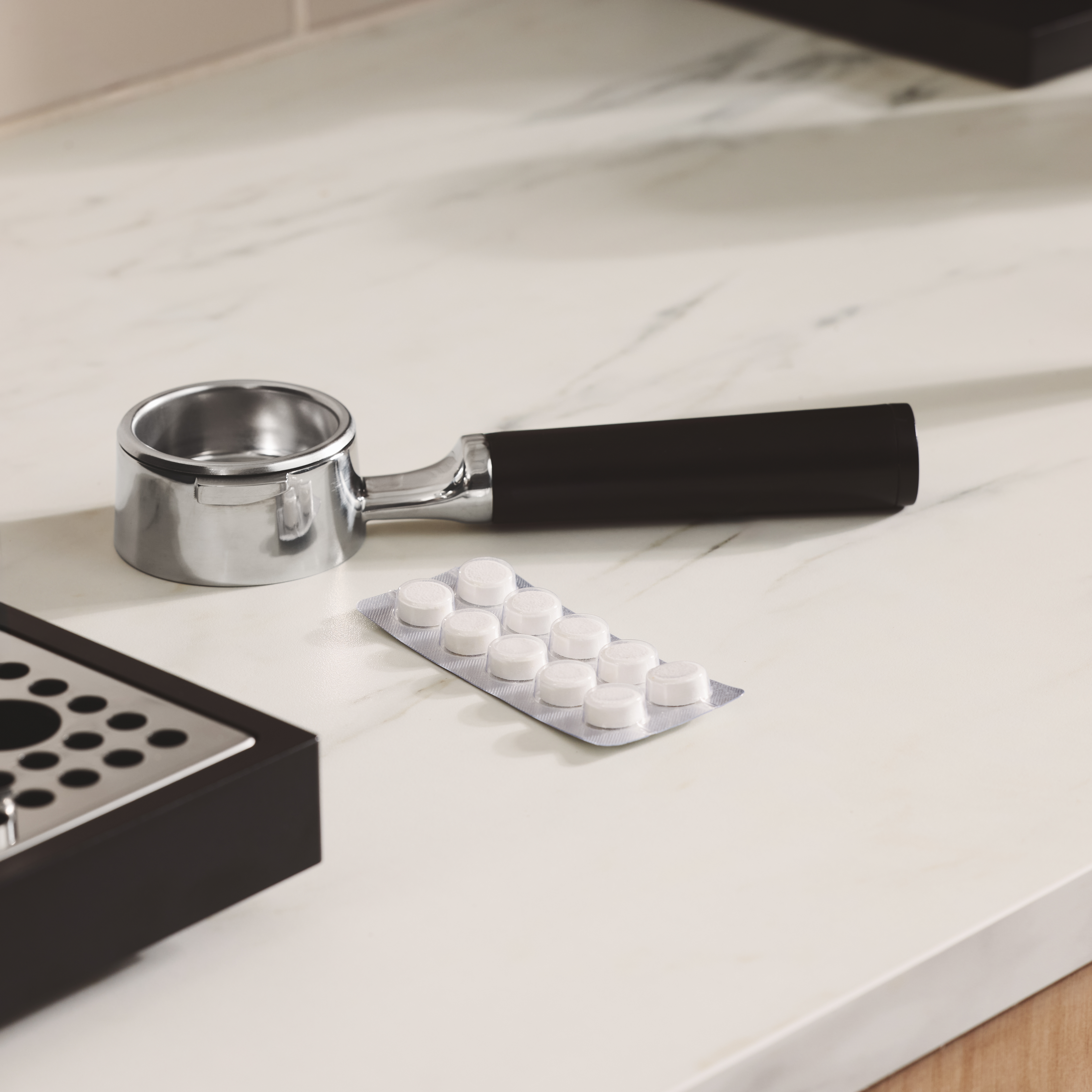 Get your supplies ready. You'll find the backflush disc stored under the mat on the top of the machine. The cleaning tablets can be found in your Series 1's accessories box.