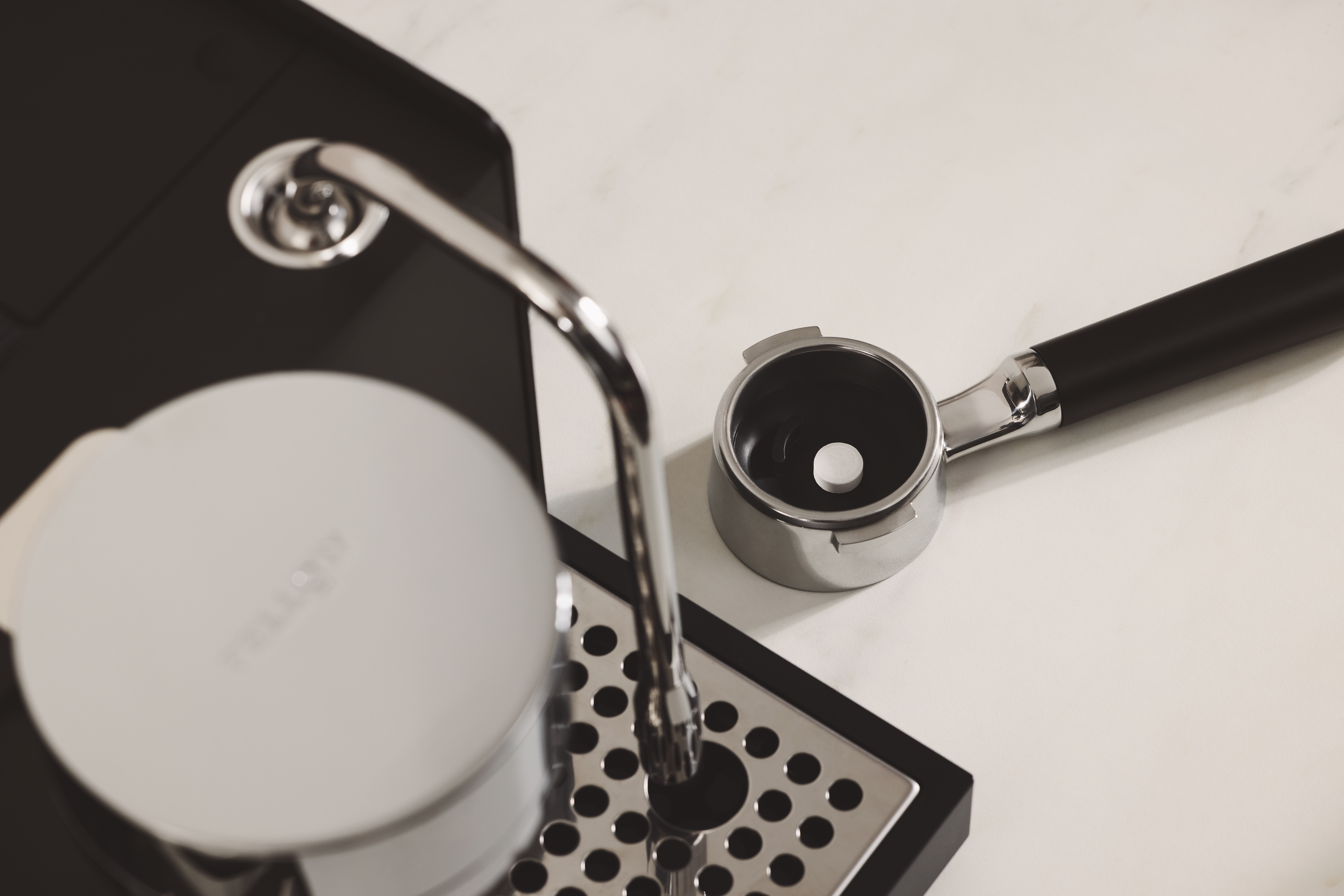 Once done, rinse off the portafilter and backflush disc. Place the backflush disc back in storage underneath the mat.